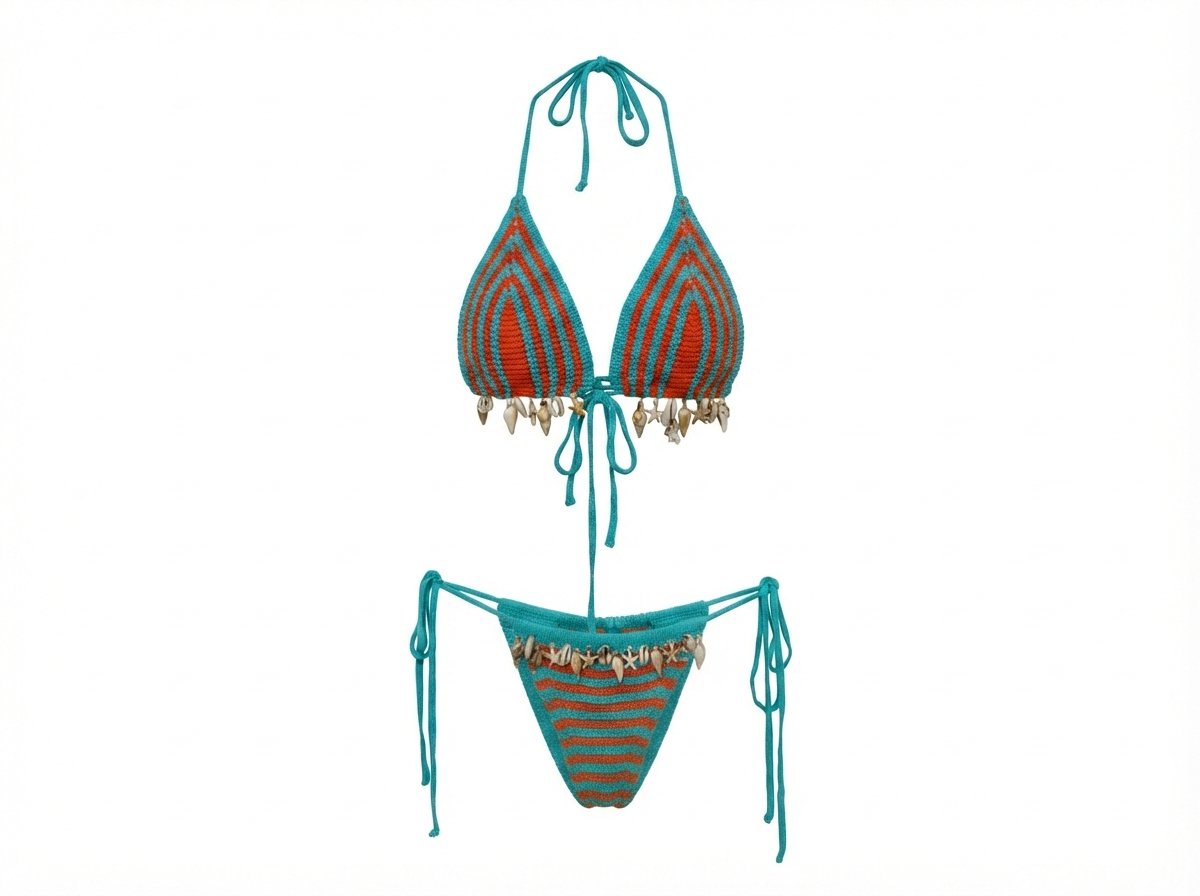 A striking crochet bikini featuring a sculpting wave-knit pattern and delicate shell trim. The Coastal Wave Shell Bikini Set includes an adjustable triangle top and tie-side bottoms for a flattering, customizable fit—perfect for beach clubs and sun-soaked escapes.