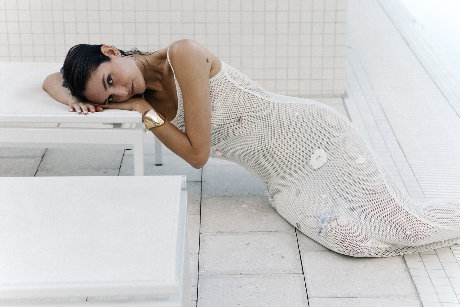 An effortlessly elegant open-knit maxi designed for sun-soaked days and warm evenings. The White Sand Shell Maxi Dress features a sculpting silhouette with refined shell-inspired embellishments that transition seamlessly from beach to resort dinner. Details Fabric & Care Fit Notes