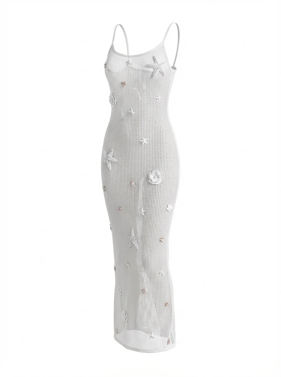 An effortlessly elegant open-knit maxi designed for sun-soaked days and warm evenings. The White Sand Shell Maxi Dress features a sculpting silhouette with refined shell-inspired embellishments that transition seamlessly from beach to resort dinner.